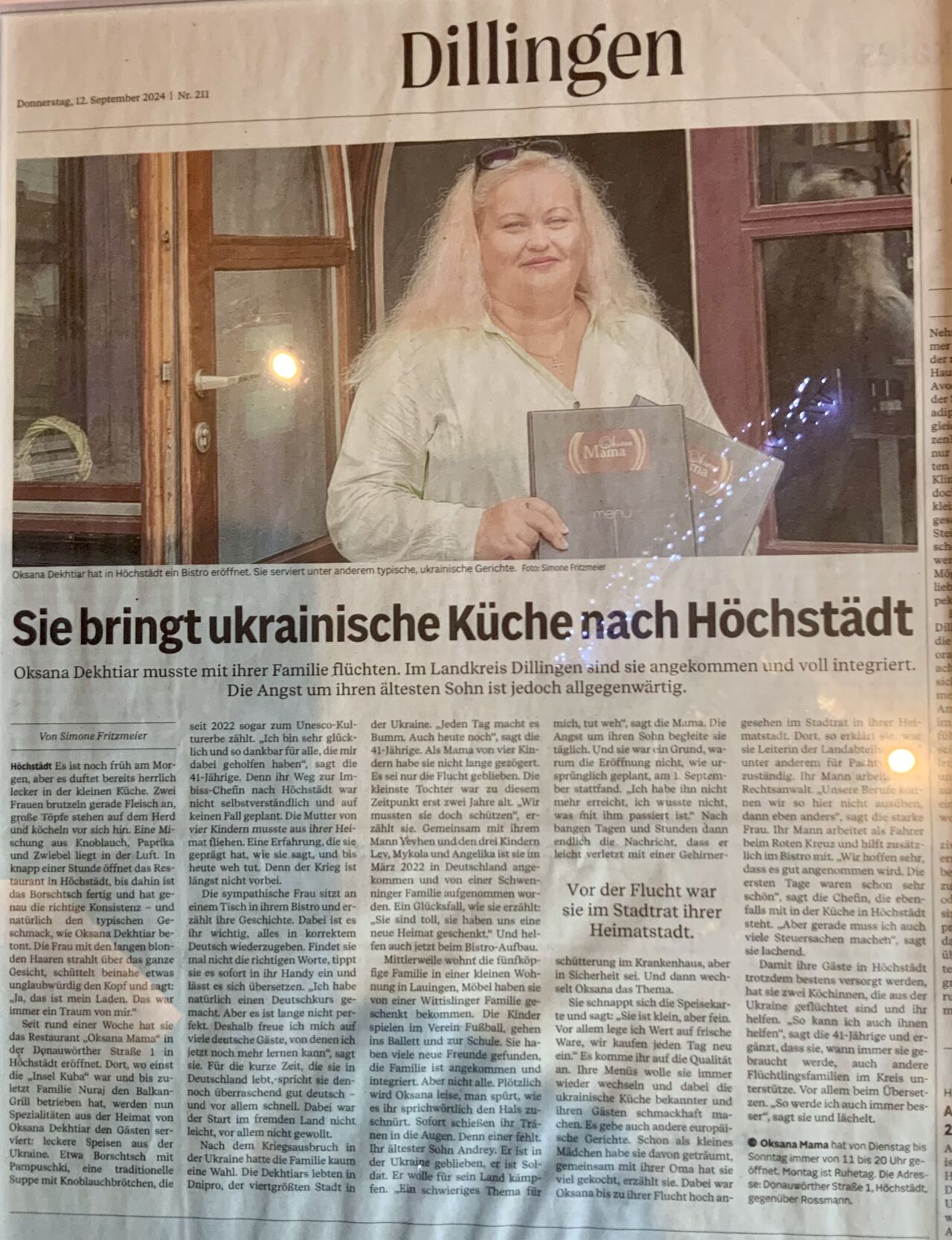 Herzlich willkommen im Mama Oksana in Höchstädt! Wir freuen uns auf Ihren Besuch. Lassen Sie sich von unserer köstlichen Auswahl an ukrainischen Spezialitäten verzaubern. Unsere erfahrenen Köche bereiten preisgekrönte, gesunde Gerichte, hausgemachte Speisen, regionale Produkte und traditionelle Gerichte zu. Genießen Sie mit Freunden und Familie unsere leckeren Speisen. Verwöhnen Sie sich mit unseren köstlichen Kuchen, Torten, Pfannkuchen und Desserts. Wir bieten eine große Auswahl an vegetarischen Gerichten für jeden Geschmack. Erfrischende Getränke stehen ebenfalls für Sie bereit. Genießen Sie Mittag- und Abendessen oder Nachmittagstee in unserem stilvollen Restaurant. Unser erstklassiger Service wird durch einen gemütlichen Biergarten und Live-Musik abgerundet.